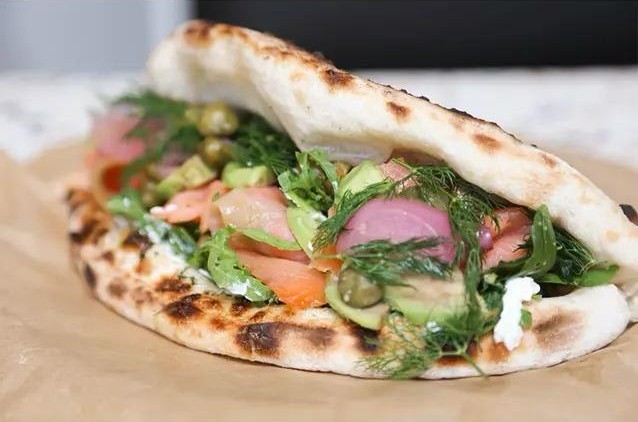 Somon Gravlax, guacamole, kırmızı soğan turşusu, dereotu, labne peyniri, kapari ve roka